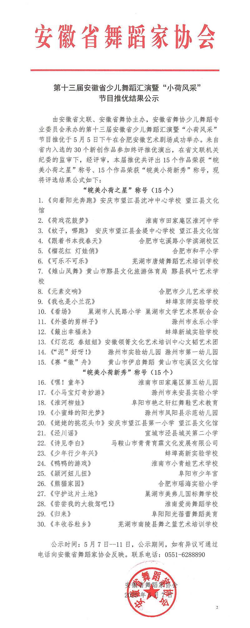 第十三届安徽省少儿舞蹈汇演暨“小荷风采”节目推优结果公示