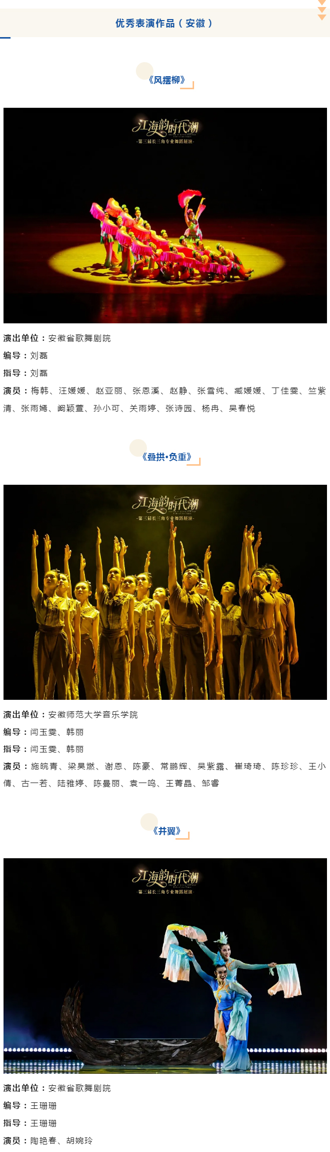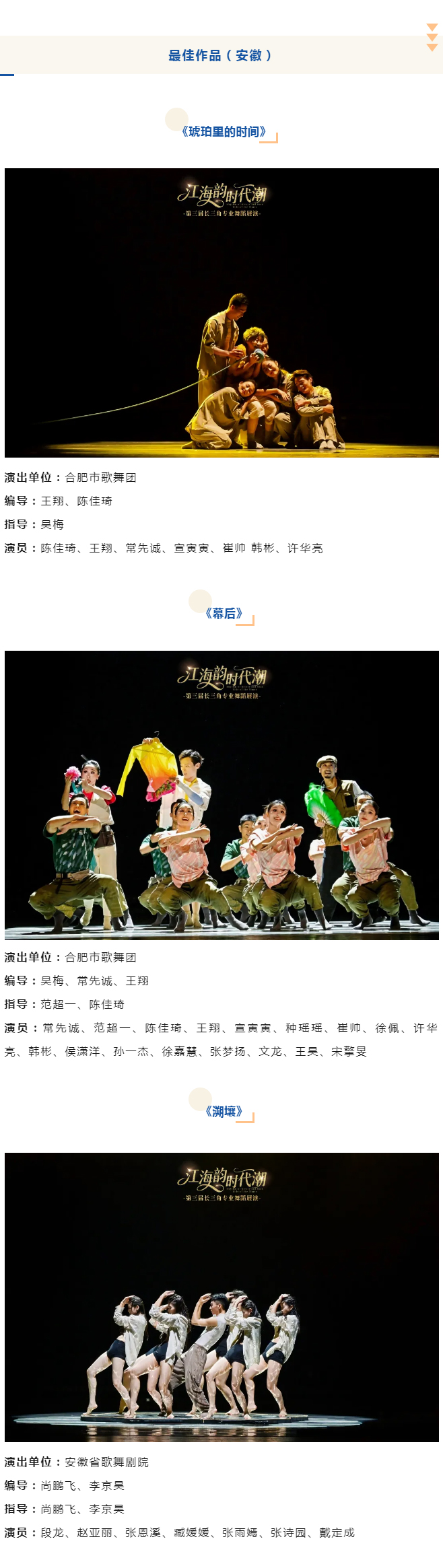 经评审委员会和组委会核定,共16部作品获最佳作品、10部作品获优秀创作作品、13部作品获优秀表演作品。其中,由安徽省舞协推荐的舞蹈作品《琥珀里的时间》《幕后》《溯壤》获最佳作品,《泾川纸问》《幸福花鼓》《上灯场》获优秀创作作品、《风摆柳》《叠拱·负重》《并翼》获优秀表演作品。