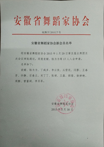 安徽省舞协2015年1月29日审批通过新会员名单
