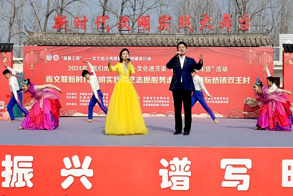 为深入学习贯彻习近平文化思想,扎实推进“强基工程”——文艺助力基层精神文明建设行动和“文艺进万家 健康你我他”新时代文明实践文艺志愿服务,营造浓厚新春氛围,助力乡村文化振兴,1月12日,省文联党组成员、副主席、书记处书记林勇率文艺小分队来到太和县阮桥镇双王村,开展文艺志愿服务活动。由此也拉开了省文联2024年“我们的中国梦——文化进万家”暨“送文化年货”活动的帷幕。中国曲协副主席、省文联副主席、省曲协主席、中国曲艺“牡丹奖”获得者孟影,省级相关文艺家协会负责人参加活动。