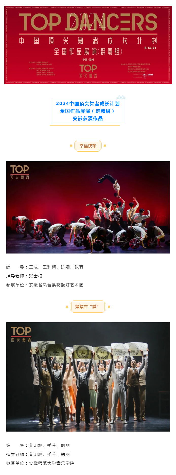 日前,“2024中国顶尖舞者成长计划”全国作品展演(群舞组)在浙江温州圆满收官。来自全国的5000余名舞者齐聚温州,在为期6天的展演中登台亮相,迅速燃起一场顶尖的群舞艺术风暴。本次展演得到了全国广大舞者的积极响应,共有3260个作品报名,143个作品参演。其中,由安徽分区推选的群舞《幸福快车》《熠熠生“徽”》《佤山之恋》《鸭鸭的游戏》精彩亮相本次展演。