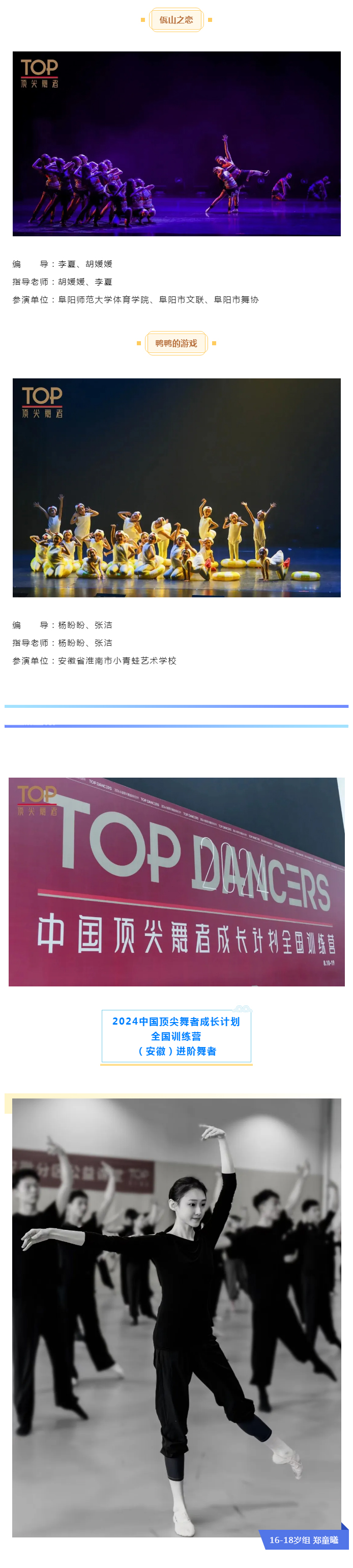 此前,为期10天的“2024中国顶尖舞者成长计划”全国训练营在山东烟台举行,共有近370名舞者从来自全国的1600余名学员中脱颖而出成功进阶,下一阶段将从进阶名单中根据提交的原创节目筛选产生全国百强。其中,由安徽分区推选的郑童曦、陈嘉瑶、潘进浩、程强、种瑶瑶、段龙、宣寅寅、臧媛媛等8位舞者顺利进阶,期待他们再创佳绩,为安徽舞蹈争取更高荣誉!