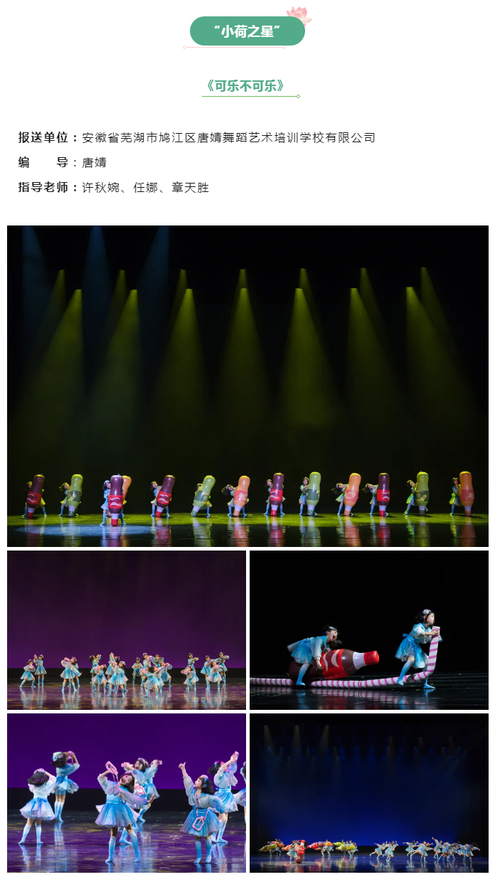 此次展演共有来自全国各地近170部作品入选,其中,由安徽省舞协报送的4部少儿舞蹈作品入选本次展演。经过激烈角逐,《可乐不可乐》荣获“小荷之星”荣誉称号,《跟着书本找春天》《我也是小兰花》《鸭鸭的游戏》荣获“小荷新秀”荣誉称号。