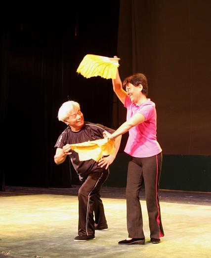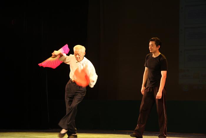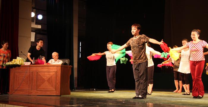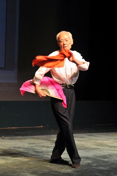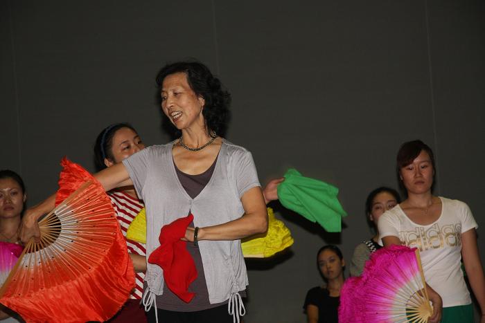 陈老首先表述了他对花鼓灯传承现状的一些忧虑,最典型的就是“只传舞,不传歌”。陈老说:“过去的花鼓灯是载歌载舞的,现在只推崇舞蹈,没了灯歌,花鼓灯就有些不全面了。因为花鼓灯是农民的艺术,本来就是给农民看的,灯歌旋律优美,歌词生动有趣,农民一听就懂,说的就是他们的生活和感情,花鼓灯得先让农民看得懂,让农民喜欢!”说到这里,陈老情不自禁地唱起了《摘棉花》和《绣荷花》,歌声动听,情意绵绵,仿佛让我们回到了过去风光无限的灯场上,陈老的灯歌赢来了学员们的阵阵喝彩声。说到花鼓灯的兰花,陈老再三强调了一个情字,所有的舞蹈动作都要发自内心,源于情感,你有多爱花鼓灯你就能跳出多少感情。陈老讲到高兴处,情不自禁舞了起来,虽然已经九十三岁的高龄了,陈老拿起扇子和手巾,依旧魅力不减,他给学员们示范起他的经典动作,边说边解释这些动作是如何从劳动和生活中提炼的,怎么做才能传情,才是真正的美,举手投足都能看出陈氏风格的特点,“颤、颠、抖”表现得淋漓尽致,俏丽动人。看了陈老的表演,学员们不停地鼓掌叫好,无不为陈老的艺术魅力和执着精神所折服。